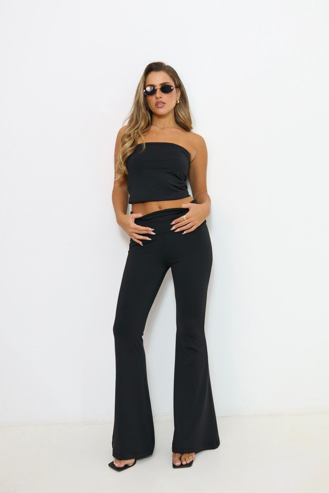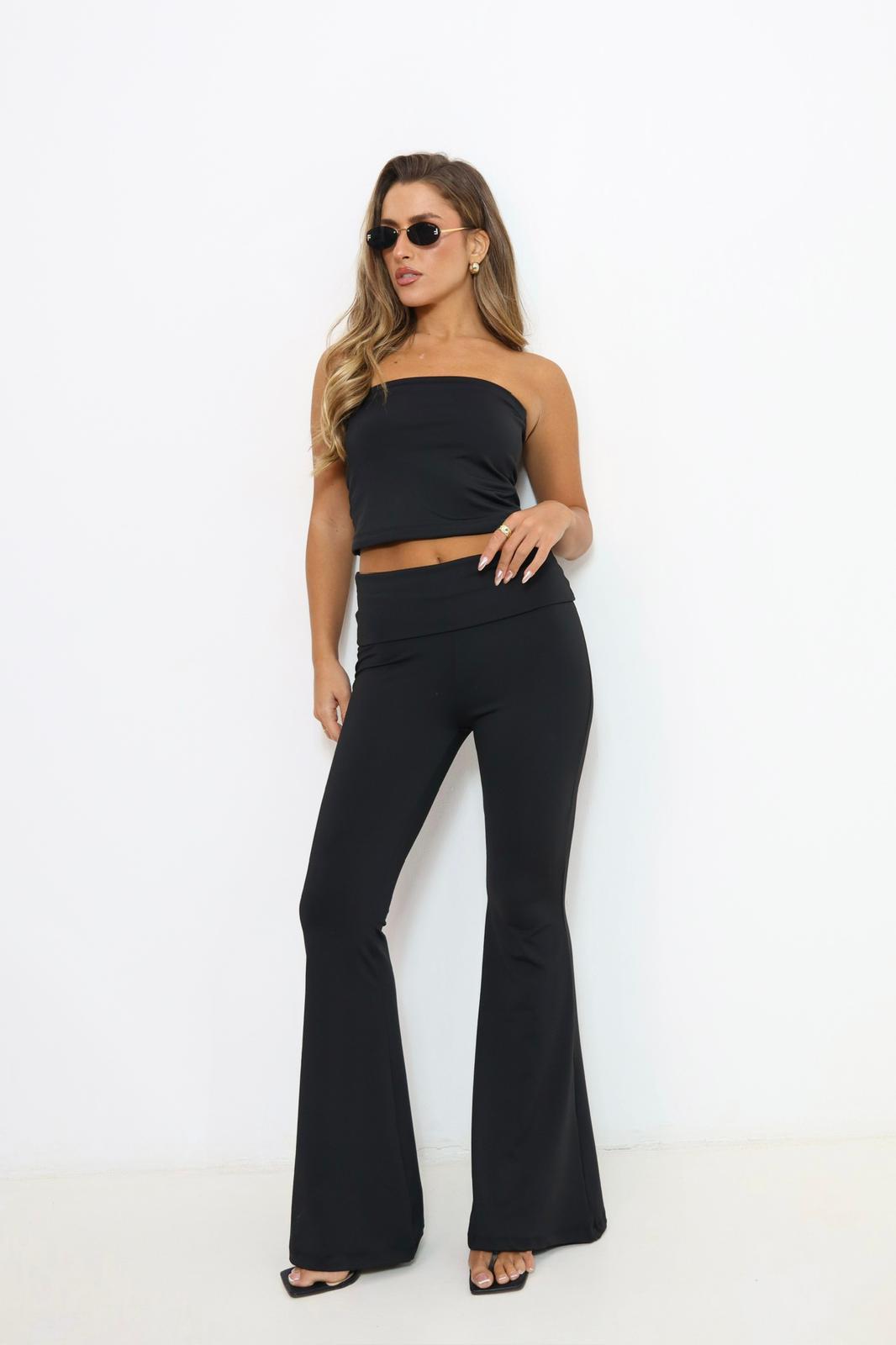 טייץ אופנתי מבד יוגה , בגיזרת בדלפון ( מתרחב למטה ) עם פס רחב שמתקפל .