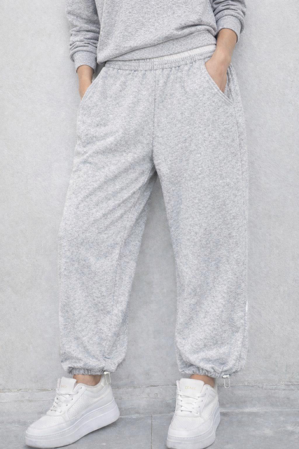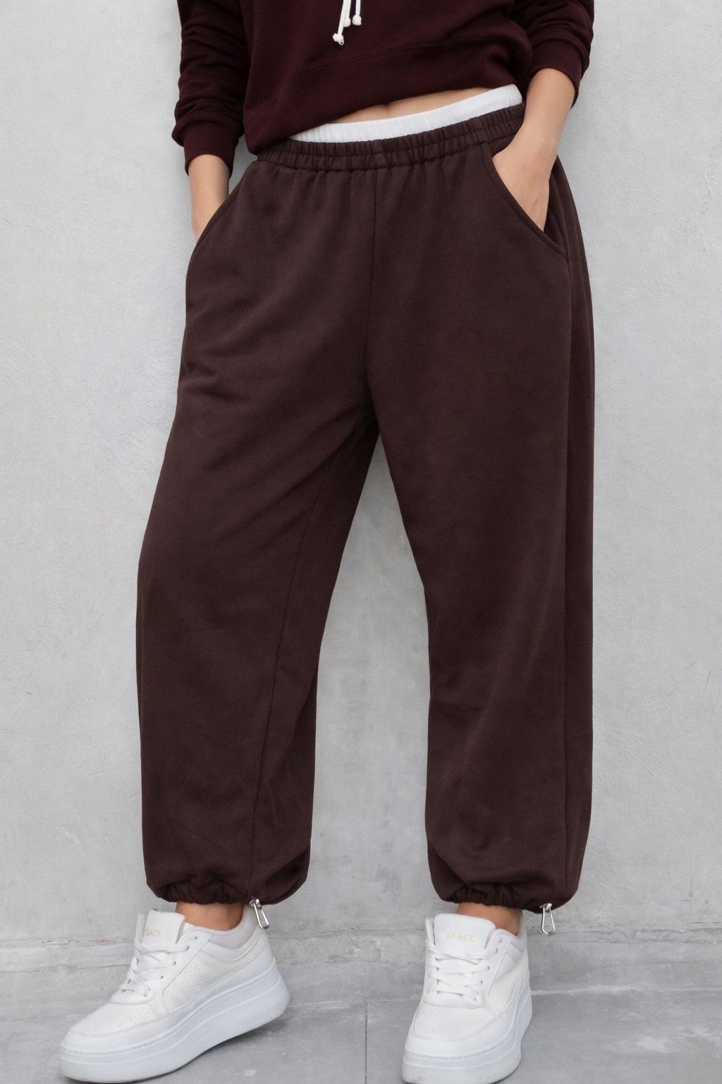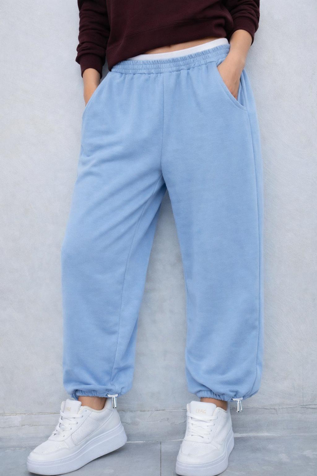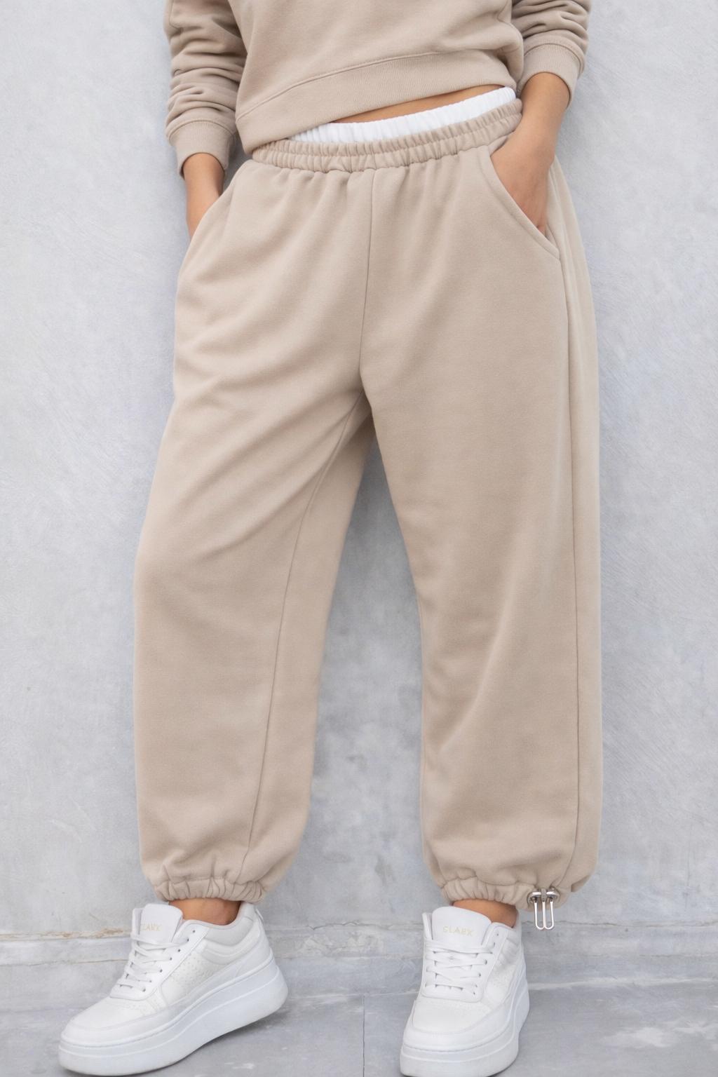 מכנסיים  מבד פרנץ’ טרי עם גומי וסטופר בתחתית המכנס , ושילוב פס לבן בחלק העליון לשידרוג המראה.